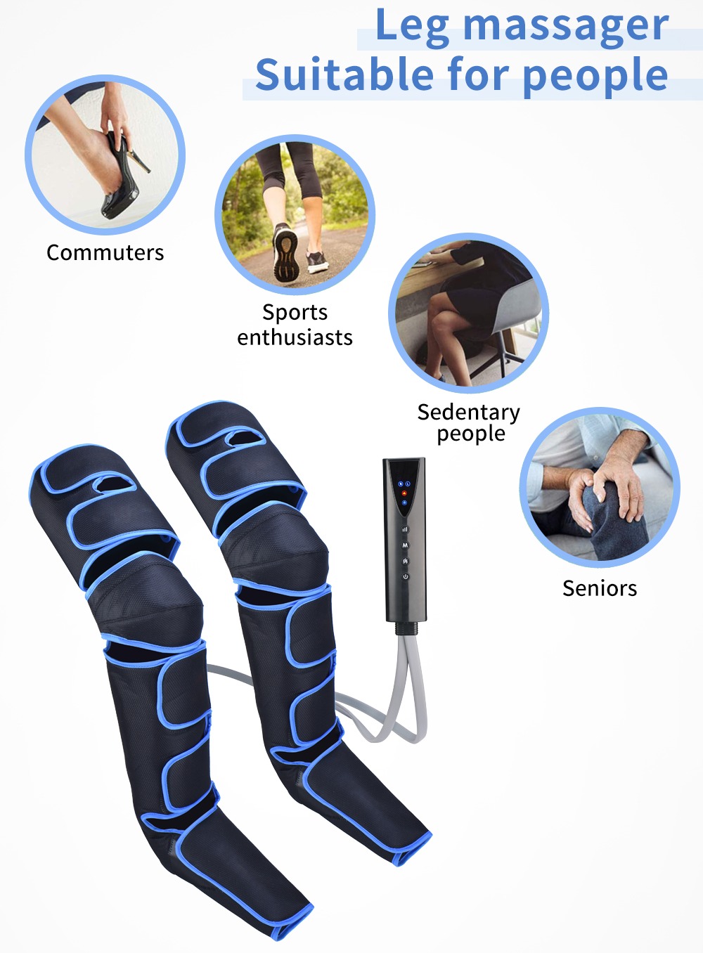 This pneumatic foot massage machine is an ideal choice for relaxing the legs and is suitable for a wide range of people. For commuters who wear high heels every day, it can effectively relieve leg fatigue and swelling; Used by sports enthusiasts after exercise, it can relieve muscle soreness and promote recovery; Long sitting individuals with poor leg blood circulation can help improve their condition and alleviate discomfort; Elderly people are prone to leg joint pain, and can also use its massage, hot compress and other functions to relieve it. It uses multiple massage methods such as air pressure and vibration to comprehensively care for the legs, with easy operation, allowing you to enjoy a professional level leg massage experience at home.